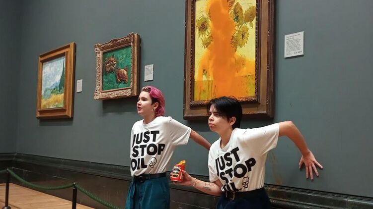 Напомним, две экоактивистки из группы Just Stop Oil облили томатным супом шедевр Винсента Ван Гога "Подсолнухи", находящийся в экспозиции Национальной галереи в Лондоне. Инцидент произошел поздним утром пятницы, 14 октября. На картину, которая оценивается более чем в 84 миллиона долларов США (86 млн евро), вылили две банки супа Heinz.