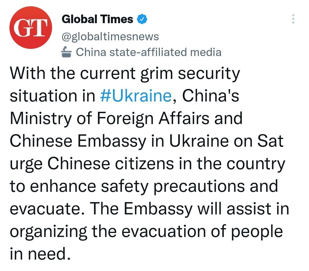 Посольство КНР обещает оказать содействие в эвакуации. Также китайцев, находящихся в Украине, просят соблюдать осторожность.
