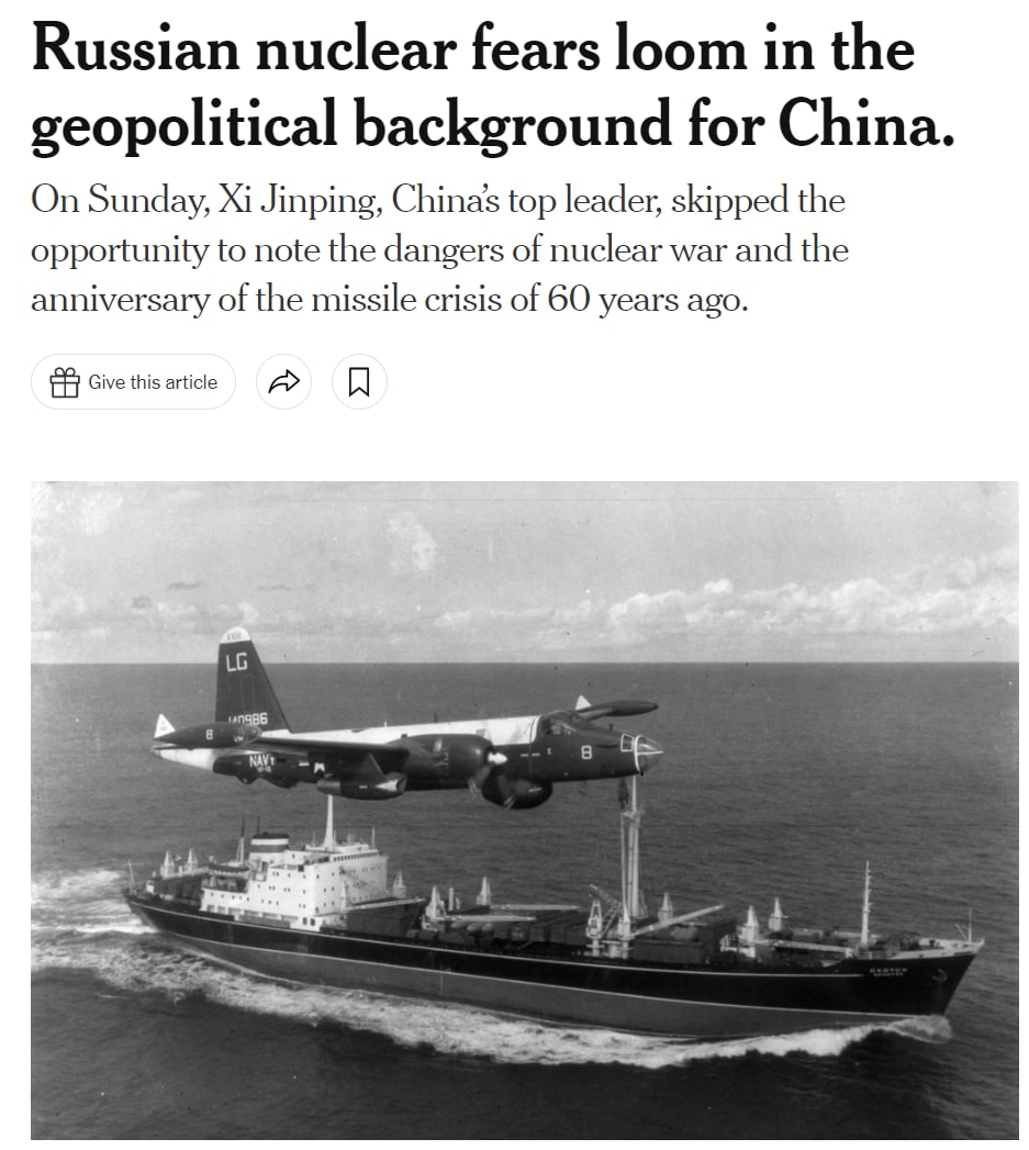 10:06 Газета New York Times сравнивает позицию Китая в противостоянии США и России на двух исторических отрезках - во время Карибского кризиса и сегодня.