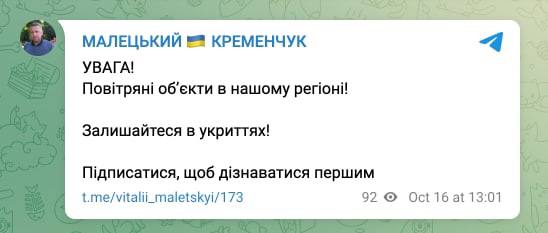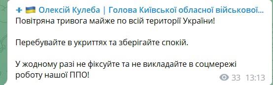 08:18 Воздушная тревога в Киеве, области и соседних регионах - Черкасской и Полтавской областях.