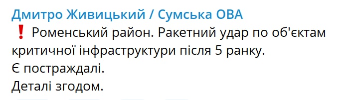 07:24 В Роменском районе Сумской области с утра ракеты поразили объект критической инфраструктуры. Есть пострадавшие, сообщил губернатор Дмитрий Живицкий.