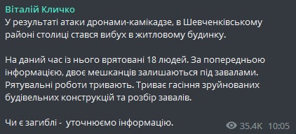 Сообщил, что в Киеве идет разбор завалов после утреннего налета беспилотников и что прямо сейчас идет новая атака дронов.