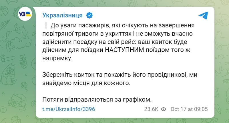 "Вниманию пассажиров, ожидающих завершения воздушной тревоги в укрытиях и тем, которые не смогут вовремя совершить посадку на свой рейс: ваш билет будет действителен для поездки следующим поездом того же направления. Сохраните билет и покажите его проводнику, мы найдем места для каждого", - говорится в сообщении.