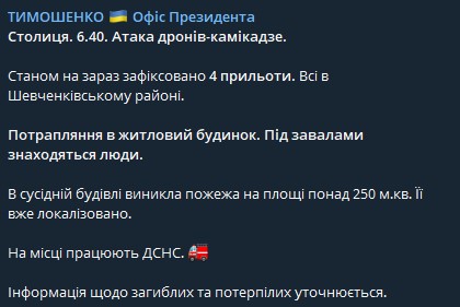Вместе с тем, замглавы Офиса президента Кирилл Тимошенко сообщил, что зафиксированы четыре прилета, все в Шевченковском районе.