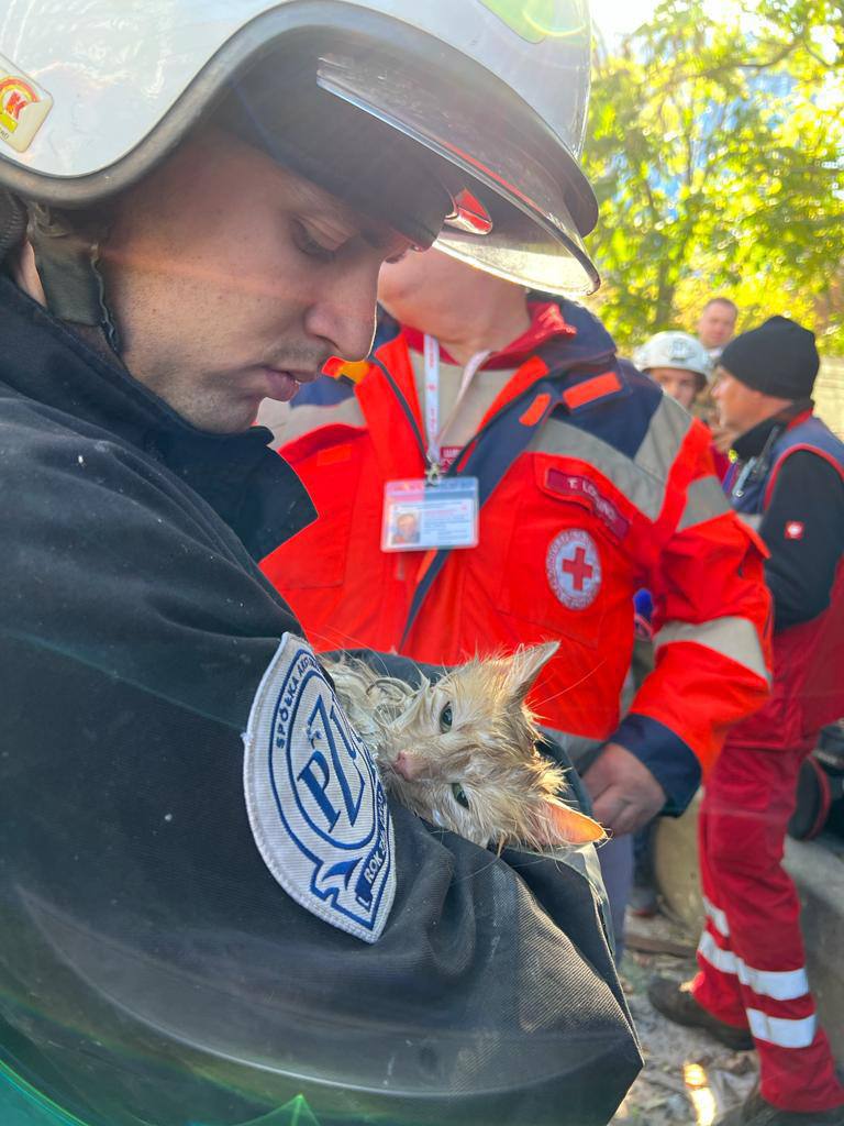 В Киеве, который с утра 17 октября атаковали дроны-камикадзе, из-под завалов обрушенного дома спасли кота.