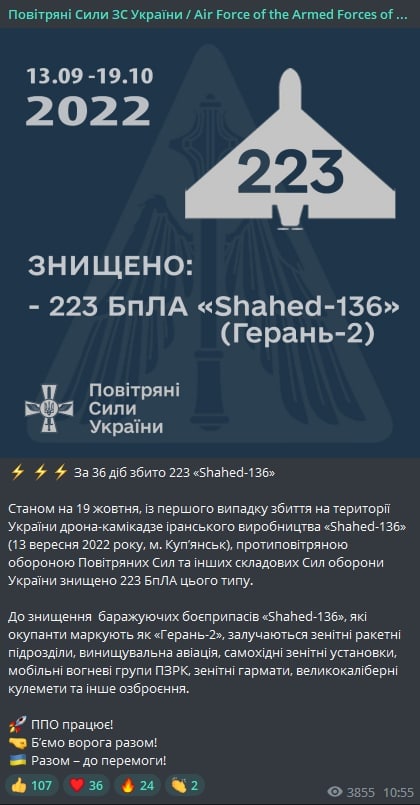 11.25 За 36 суток, которые прошли с начала использования противником дронов-камикадзе иранского производства, украинские военные уже сбили 223 "Shahed-136", сообщила пресс-служба командования Воздушных сил ВСУ.