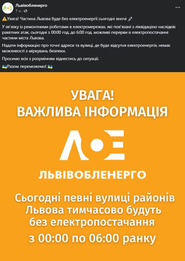 "Только что провели совещание по Минэнерго, Минэнергетики, руководителям обладминистраций. Завтра по всей территории Украины будут вводиться ограничения на пользование электроэнергией, прежде всего они будут касаться предприятий и заводов.
