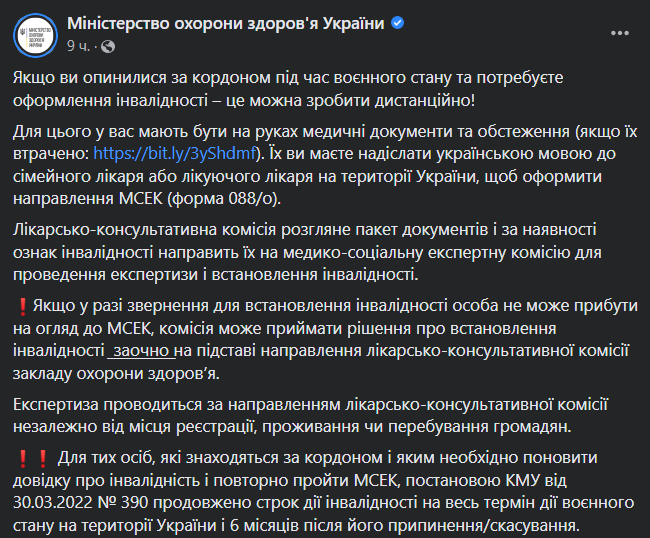 Также указывается, что для тех лиц, которые находятся за границей и которым необходимо восстановить справку об инвалидности и повторно пройти МСЭК, постановлением КМУ от 30.03.2022 № 390 продлен срок действия инвалидности на весь срок действия военного положения на территории Украины и 6 месяцев после его прекращения/отмены.