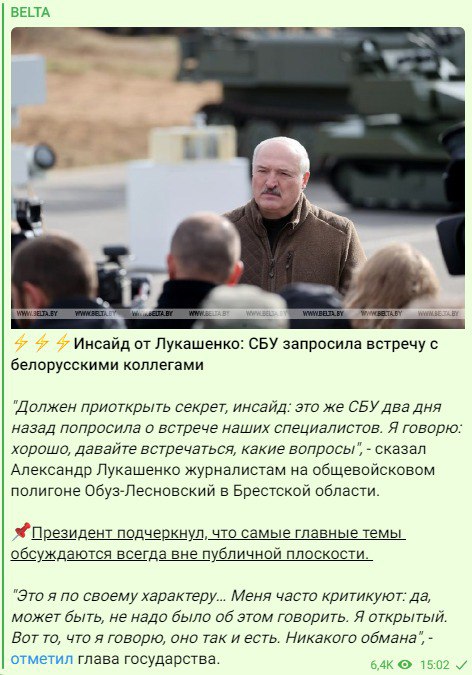 "Должен приоткрыть секрет, инсайд: это же СБУ два дня назад попросила о встрече наших специалистов. Я говорю: хорошо, давайте встречаться, какие вопросы", - сказал Александр Лукашенко.