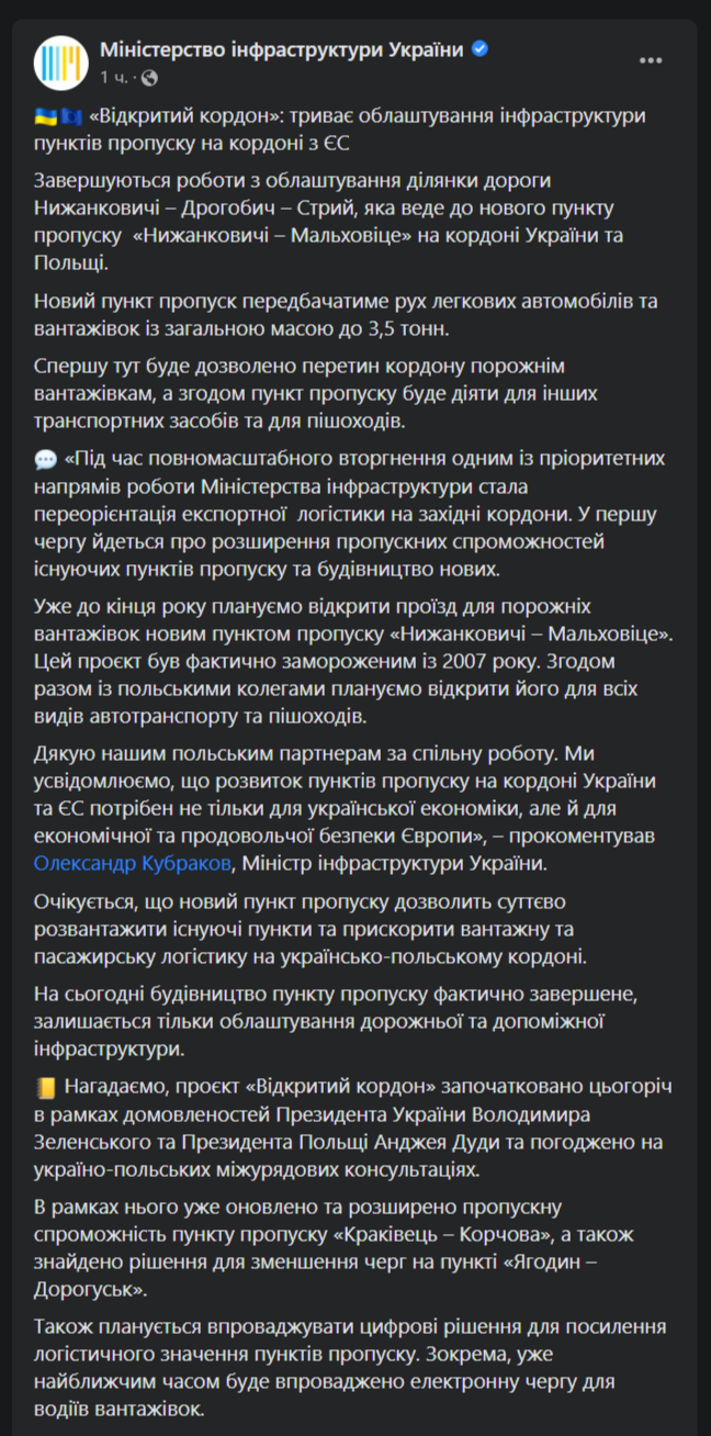 "Уже к концу года планируем открыть проезд для пустых грузовиков новым пунктом пропуска Нижанковичи - Мальховице", - говорится в сообщении.