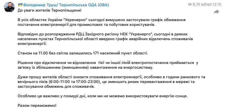 Также сообщают о введении графика отключений в Тернопольской области. Там без света 171 населенный пункт. Решение об отключении или возобновлении подачи электричества будет приниматься в зависимости от нагрузки на систему, сообщает губернатор Владимир Труш.
