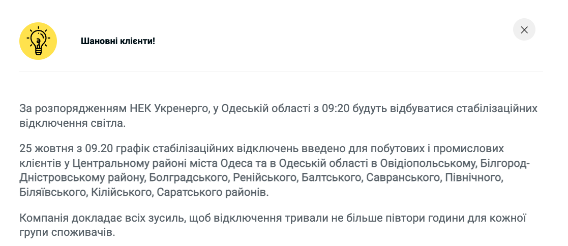 В центральной части Одессы и в ряде населенных пунктов области 25 октября вводится режим отключений электроэнергии.