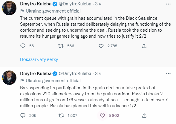 "Россия планировала это (выход из инициативы - Ред.) задолго до этого. Нынешняя очередь зерновозов накапливалась в Черном море с сентября, когда Россия начала умышленно тормозить работу коридора и пытаться сорвать договоренность. РФ решила возобновить "голодные игры" уже давно, а теперь ищет оправдания для этого", - отметил Дмитрий Кулеба.