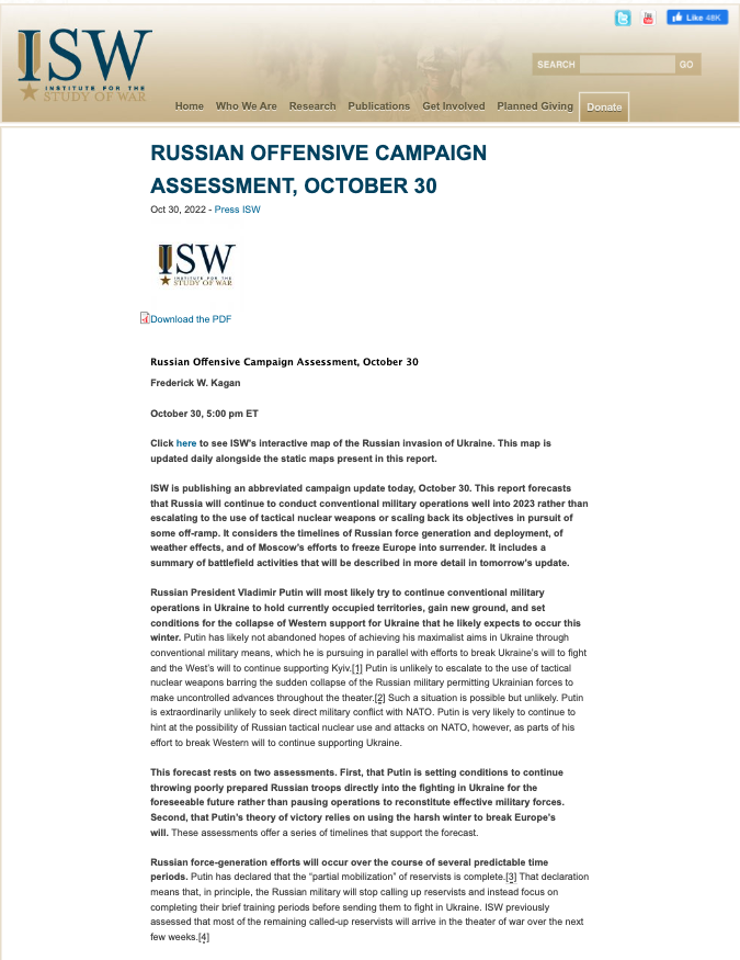 Американский Институт изучения войны полагает, что Россия продолжит проводить обычные военные операции вплоть до 2023 года, а применение тактического ядерного оружия на данный момент маловероятно.