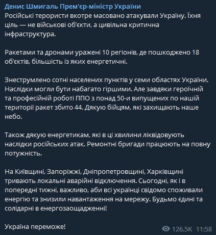 Шмыгаль заявил, что цель россиян "не военные объекты, а гражданская критическая инфраструктура". Россияне их атаковали дронами и ракетами.