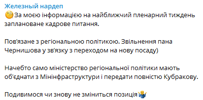"Якобы само министерство региональной политики должны объединить с Мининфраструктуры и передать полностью Кубракову. Посмотрим, не изменится ли опять позиция", - написал Железняк.