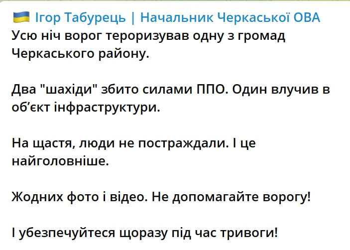 8:20 Подтвержден удар "Шахидом" в Черкасской области этой ночью.