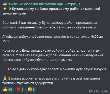 10:21 Сегодня в Бучанском и Вышгородском районах Киевской области могут быть слышны звуки взрывов.