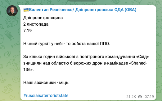 Еще шесть беспилотников "Шахид" было сбито ночью в небе над Днепропетровской областью, сообщил губернатор Валентин Резниченко.