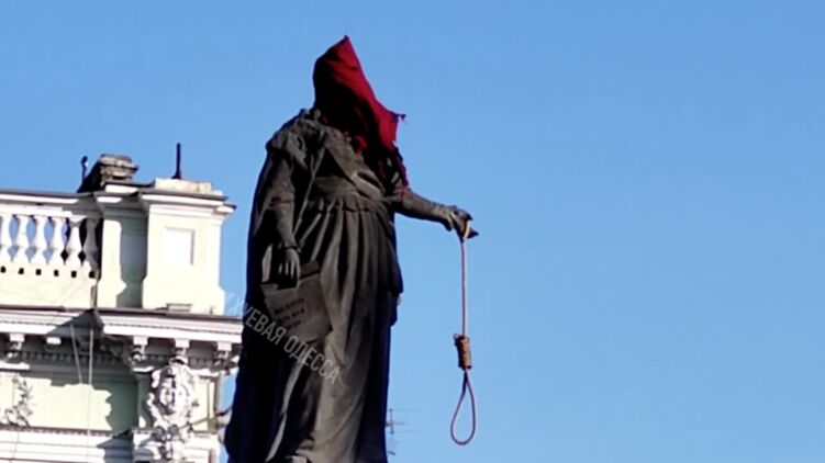 В Одессе неизвестные надели на голову памятника основательнице города Екатерине II красный колпак палача, а к руке привязали виселицу.