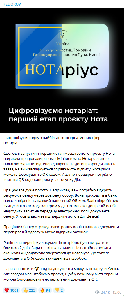 "Например, вам нужно открыть счет в банке через доверенное лицо. Она приходит в банк и предоставляет доверенность, на которую нанесен QR-код", – написал вице-премьер - министр цифровой трансформации Украины Михаил Федоров.