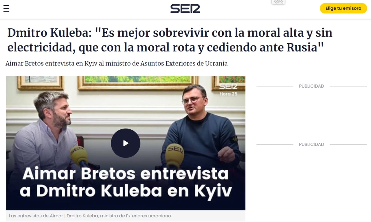 10:33 Отключение электроэнергии и возможность оставаться дома без света предоставляют возможность "заниматься любовью и наслаждаться жизнью", заявил глава МИД Украины Дмитрий Кулеба в интервью испанской радиостанцией Cadena SER, отвечая на вопрос про ситуацию с перебоями электроснабжения.