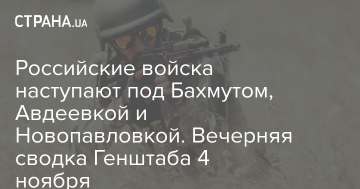 В Генеральном штабе Вооруженных сил Украины опубликовали оперативную сводку с фронта по состоянию на 18:00 4 ноября. Сообщается, что российские войска наступают под Бахмутом, Авдеевкой и Новопавловкой.
