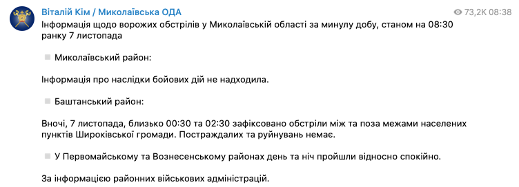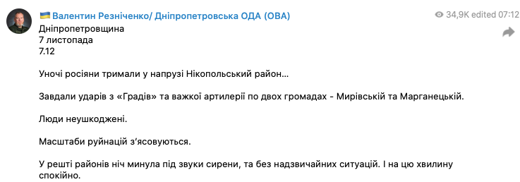В ночь с 6 на 7 ноября армия РФ обстреливала Днепропетровскую и Николаевскую области.