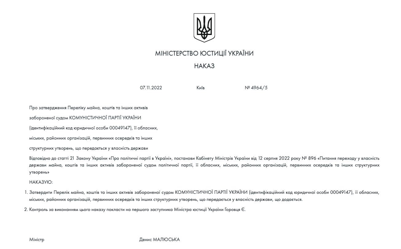 Министр юстиции Денис Малюська подписал приказ, которым утвердил перечень имущества запрещенной судом "Коммунистической партии Украины", которое будет передано в собственность государства.