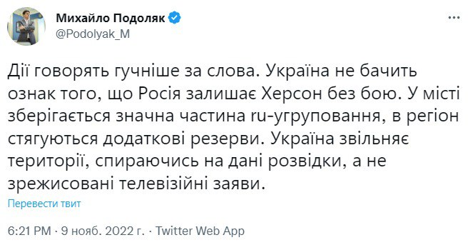 22.10 Россияне отходят в Херсонской области, но глубина этого отхода еще изучается.