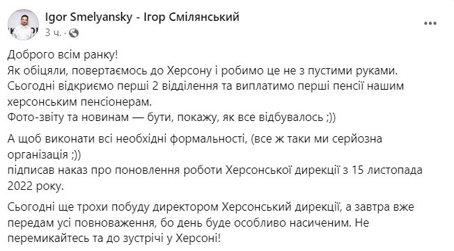 "Сегодня откроем первые 2 отделения и выплатим первые пенсии нашим херсонским пенсионерам... А чтобы выполнить все необходимые формальности (все же мы серьезная организация) подписал приказ о возобновлении работы Херсонской дирекции с 15 ноября 2022 года", - написал он.