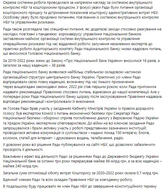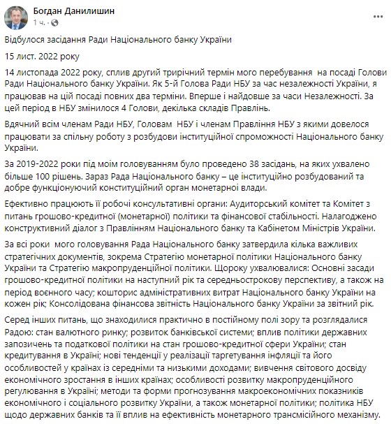 "14 ноября 2022 года, истек второй трехлетний срок моего пребывания в должности председателя Совета Национального банка Украины", - написал он.