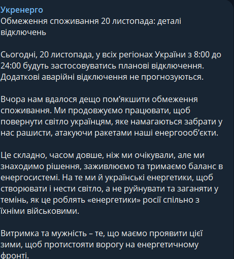 "Сегодня, 20 ноября, во всех регионах Украины с 8.00 до 24.00 будут применяться плановые отключения. Дополнительные аварийные отключения не прогнозируются. Вчера нам удалось несколько смягчить ограничение потребления", - говорится в сообщении "Укрэнерго".