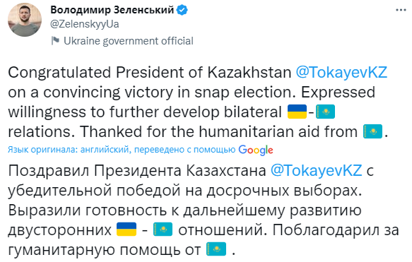 "Поздравил президента Казахстана Касыма-Жомарта Токаева с уверенной победой на внеочередных выборах. Выразил заинтересованность в дальнейшем развитии двусторонних отношений между Украиной и Казахстаном. Поблагодарил за гуманитарную помощь от Казахстана", - написал он в Twitter.