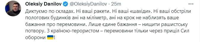 "Диктуем по слогам. Ни ваши ракеты. Ни ваши "шахиды". Ни ваши обстрелы роддомов ни на миллиметр, ни на шаг не приблизят ваше желание о переговорах. Только единственное желание – уничтожать рашистское чудовище. Со страной-террористом – переговоры только через прицел Сил обороны", - написал Данилов.