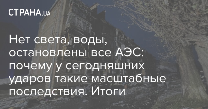 "Сегодняшний ракетный обстрел привел к временному обесточиванию всех атомных станций, большинству тепловых и гидроэлектростанций. Также поражены объекты электропередачи. В результате было обесточено подавляющее большинство потребителей электроэнергии по всей стране", - заявило Минэнерго.