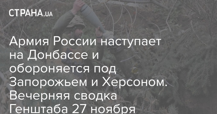 В Генеральном штабе Вооруженных сил Украины опубликовали оперативную сводку с фронта по состоянию на 18:00 27 ноября. Сообщается, что россияне атакуют на Донбассе и обороняются под Запорожьем и Херсоном.