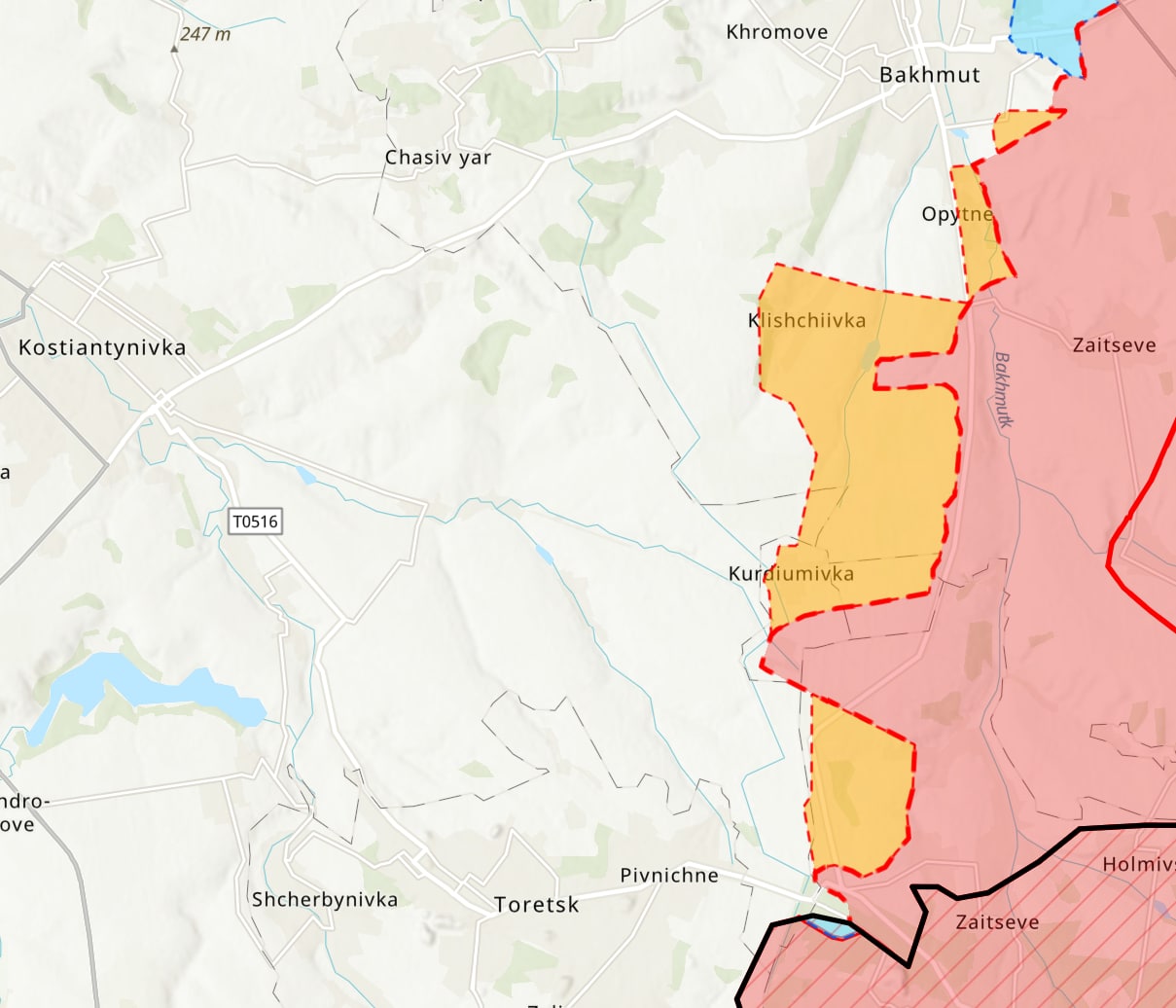 Курдюмовка находится к югу от Бахмута и занимает высоты, позволяющие российской артиллерии наносить удары по соседним Часов Яру и Константиновке.