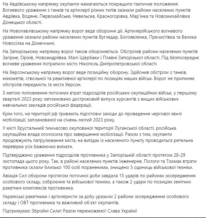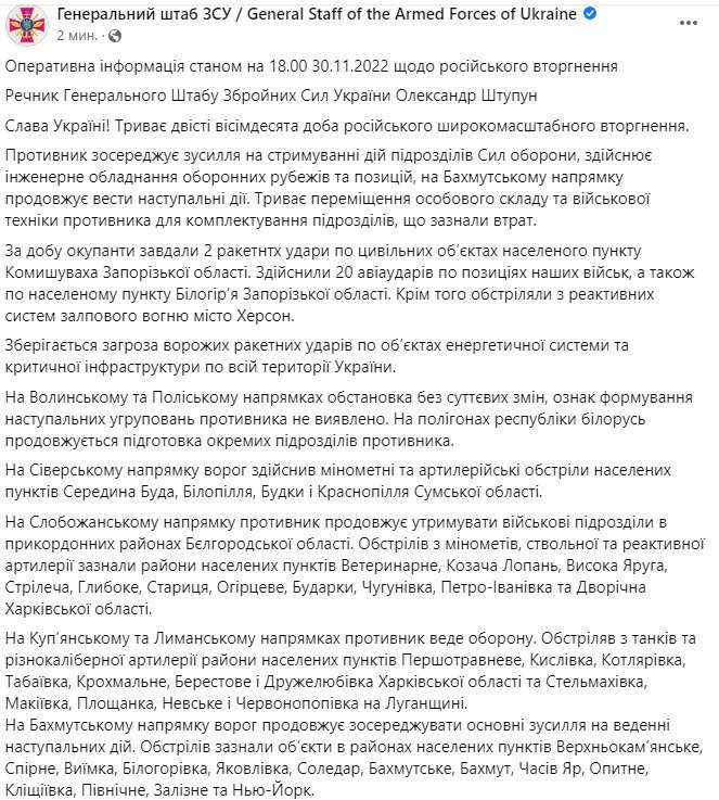 Генштаб ВСУ опубликовал оперативную информацию о российском вторжении по состоянию на 18:00 30 ноября. Сообщается, что россияне наступают на Бахмутском направлении, на Авдеевском - пытаются улучшить тактическое положение.