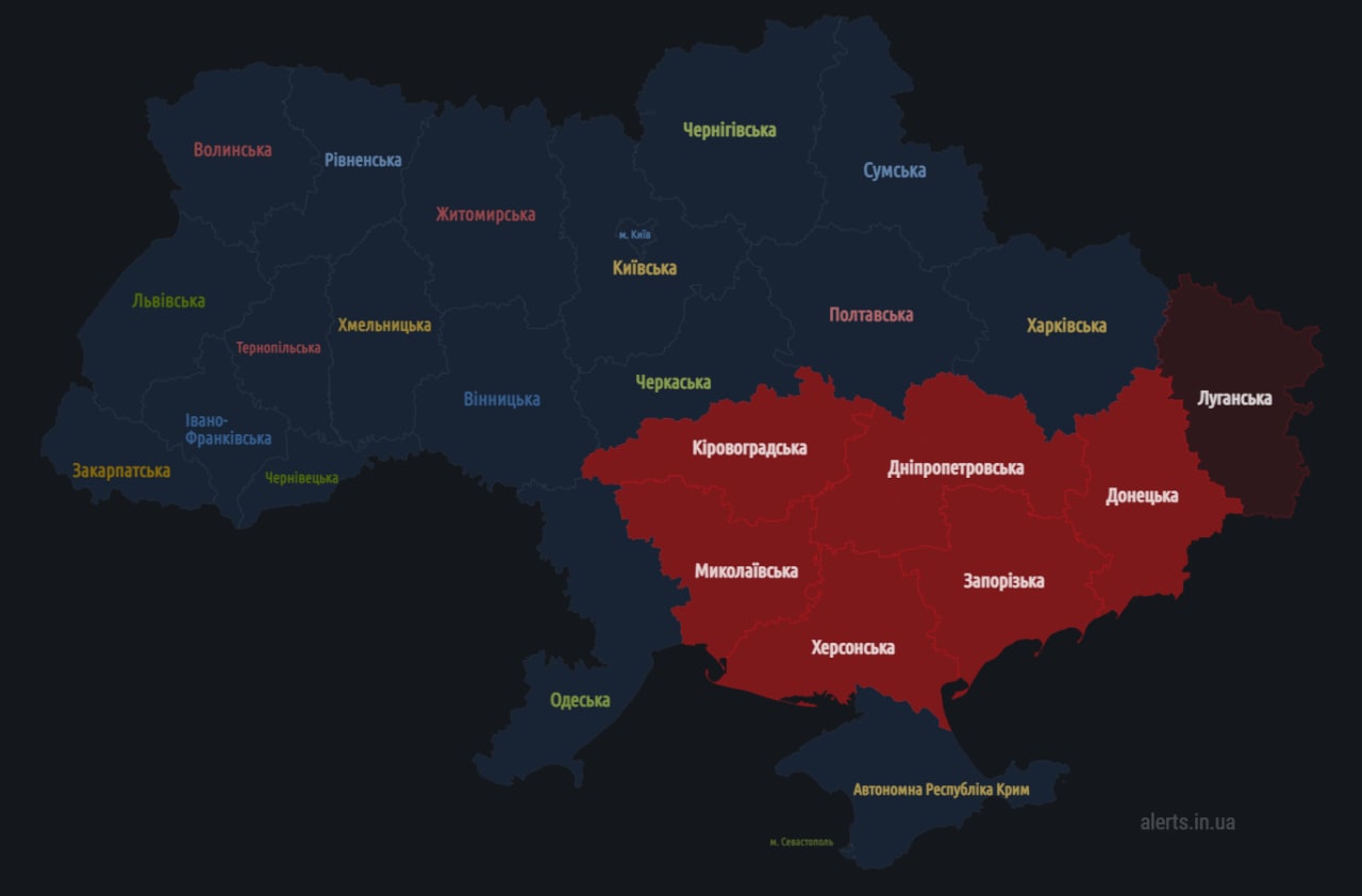 14.30 Воздушная тревога во всех областях кроме Крыма.