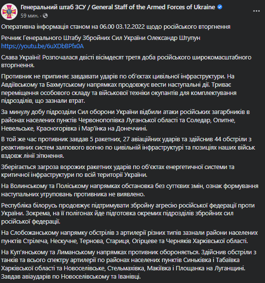 В субботу, 3 декабря, Генштаб Вооруженных сил Украины опубликовал свежую сводку с фронта.