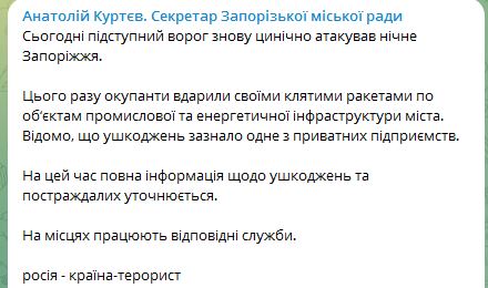 "В этот раз оккупанты ударили своими проклятыми ракетами по объектам промышленной и энергетической инфраструктуры города. Известно, что повреждения получило одно из частных предприятий" - сообщил он в телеграм-канале.