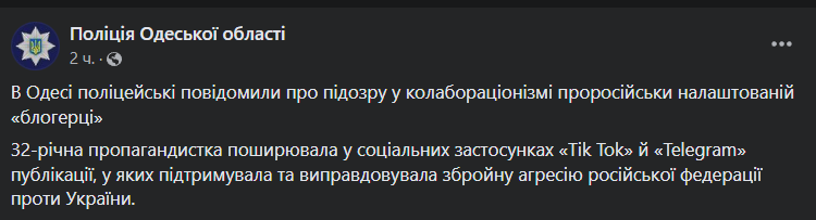 В Одессе сообщают о задержании блогерши, которая в Tiktok и Telegram оправдывала вторжение РФ в Украину.
