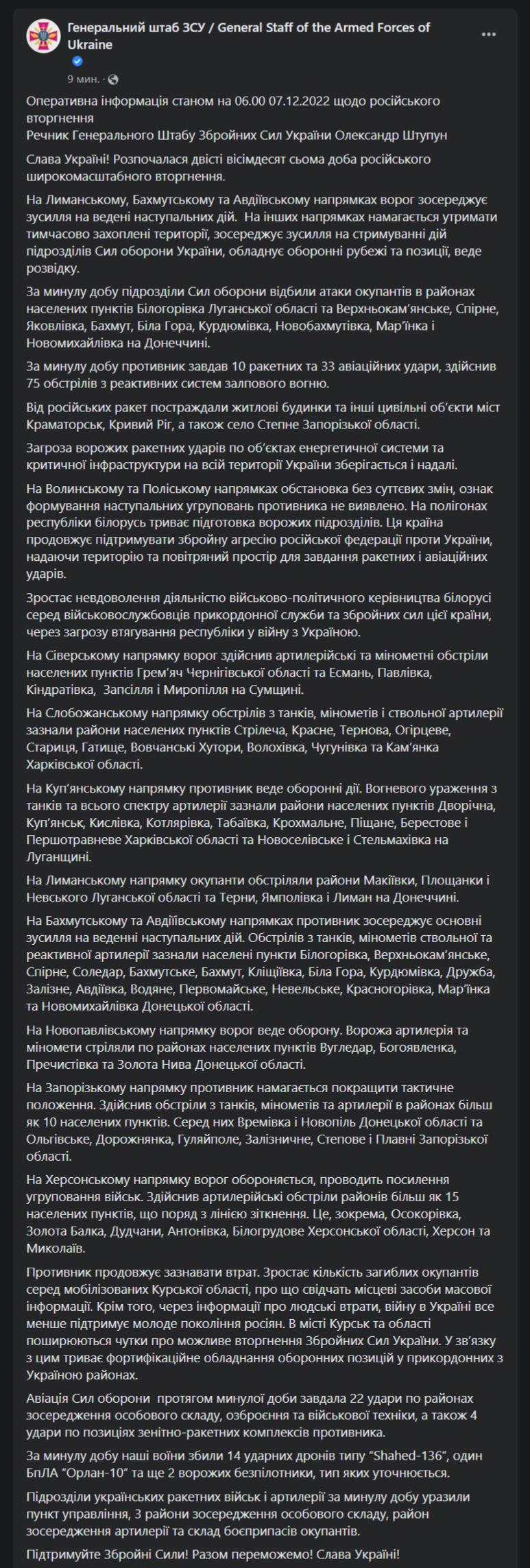 07:00 Утренняя сводка Генштаба ВСУ за 7 декабря: