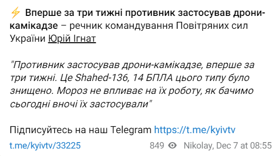 "Противник применил дроны-камикадзе, впервые за три недели. Это Shahed-136, 14 БПЛА этого типа было уничтожено. Мороз не влияет на их работу, как видим, сегодня ночью их применили", - сказал он.