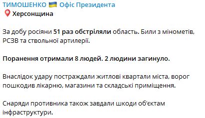 Заместитель руководителя Офиса президента Украины Кирилл Тимошенко сообщает о том, что за последние сутки россияне 51 раз обстреляли Херсонскую область. В результате погибли два человека, еще восемь - получили ранения.