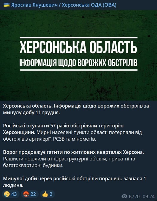 Противник продолжает наносить удары по жилым кварталам Херсона, удары наносятся по инфраструктурным объектам, частным и многоквартирным жилым домам.