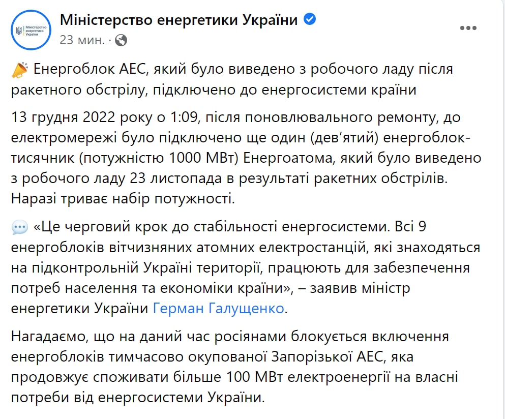 В ночь с 12 на 13 декабря к энергосистеме Украины подключили уже девятый энергоблок-тысячник (на 1000 МВт). Сейчас он набирает мощность.