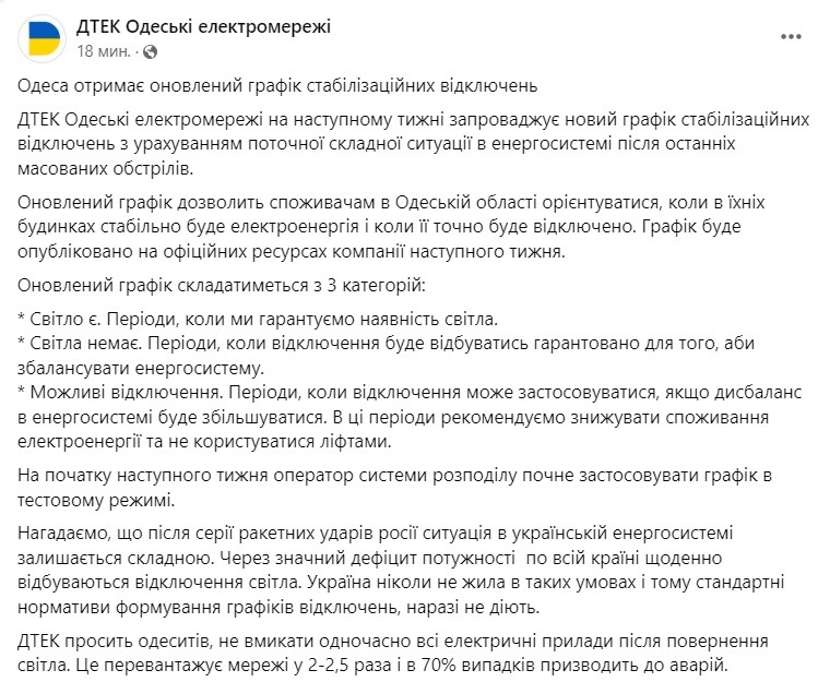 ДТЭК вводит в Одессе новые графики стабилизационных отключений, которые заработают уже на следующей неделе.