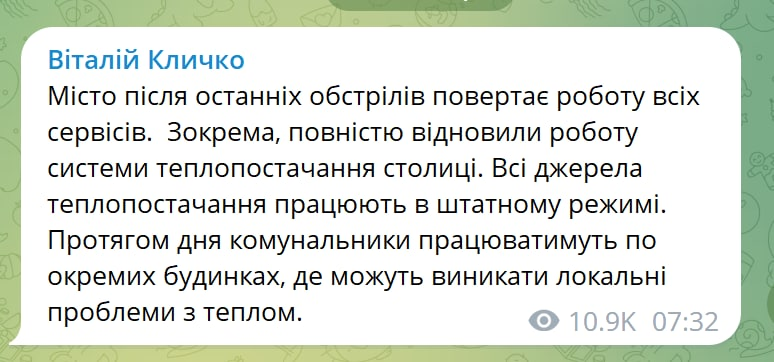 "Город после последних обстрелов возвращает работу всех сервисов. В частности, полностью возобновлена работа системы теплоснабжения столицы. Все источники теплоснабжения работают в штатном режиме. В течение дня коммунальщики будут работать по отдельным домам, где могут возникать локальные проблемы с теплом", - написал Кличко.